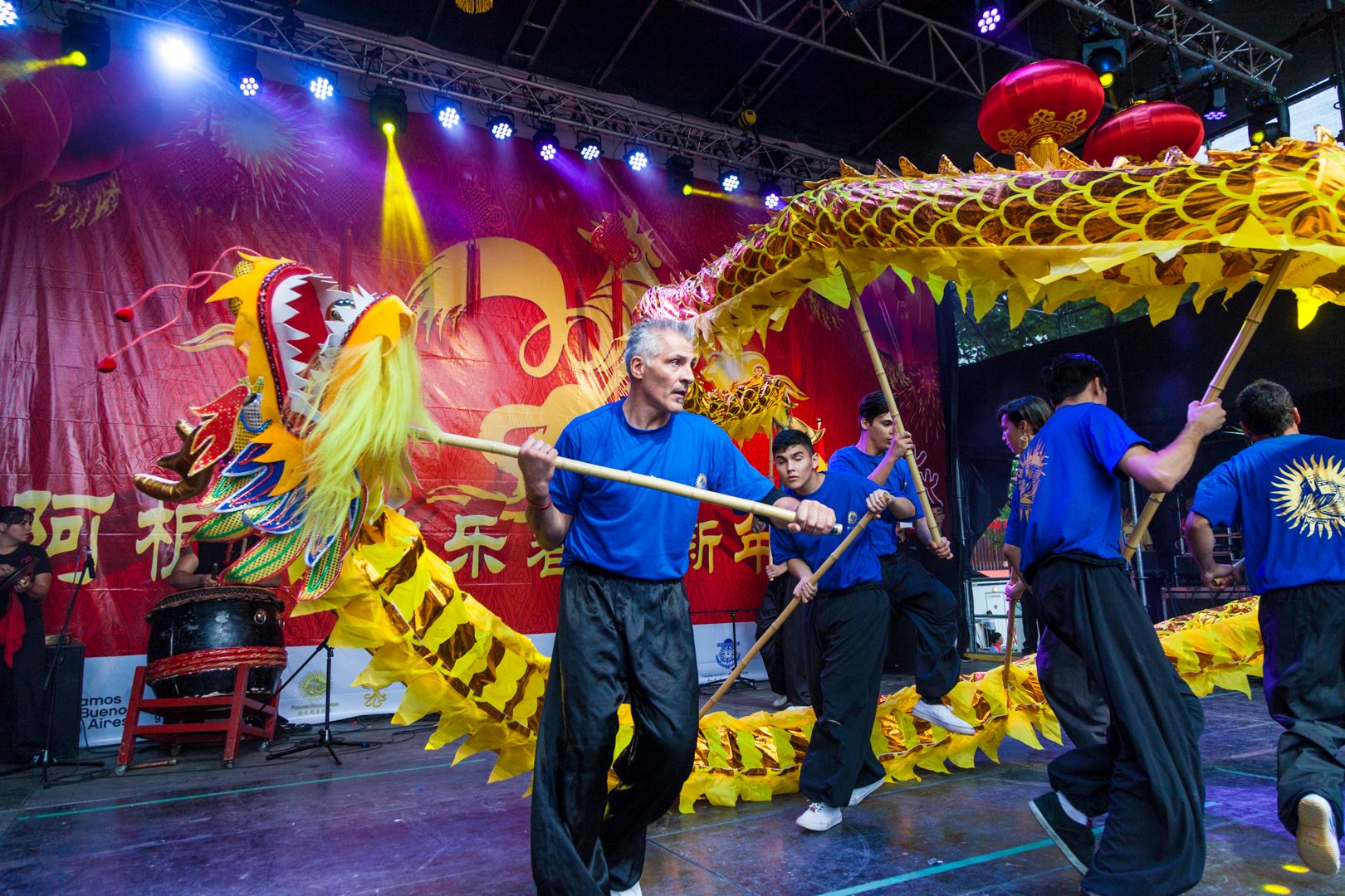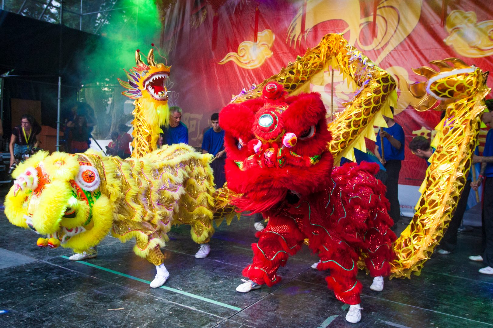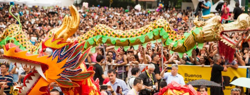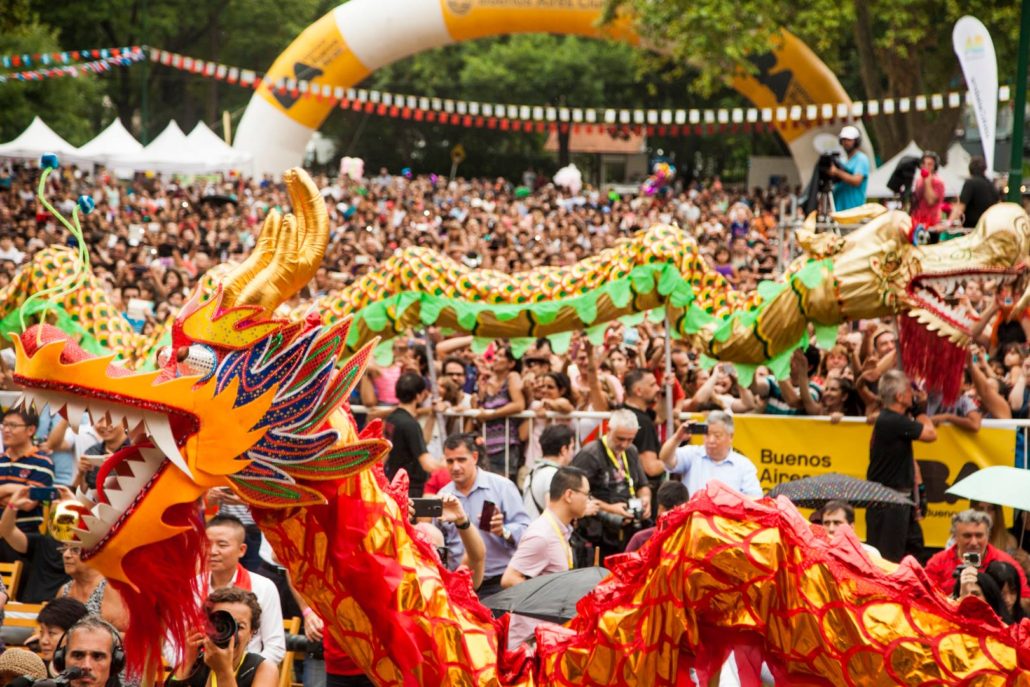 Durante la fiesta de año nuevo chino, el Dragón recorre las calles bendiciendo, dando suerte y buena fortuna al público. Para recibir este favor, es necesario que la gente levante los brazos y deje que el cuerpo y la cola de este ser mítico lo toque.