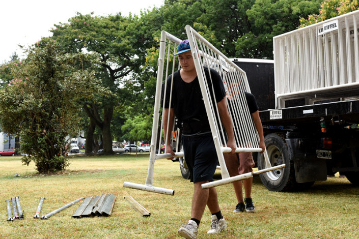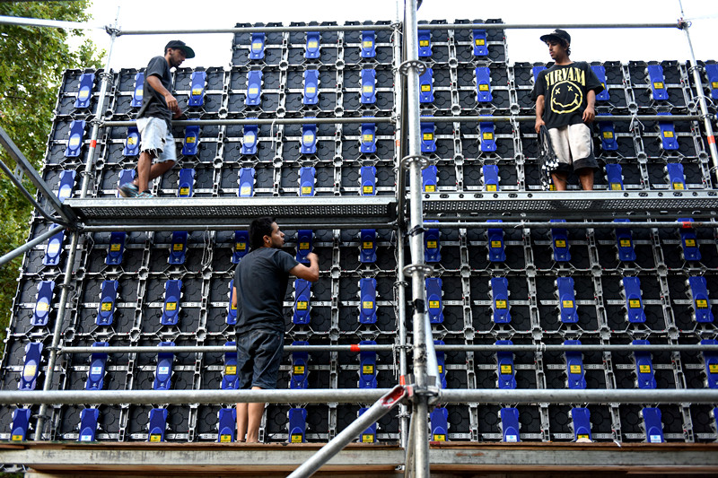 为确保演出现场秩序,工人们正在搬运护栏,将整个演出现场用护栏连接起来,确保观众在安全的环境中观看演出。