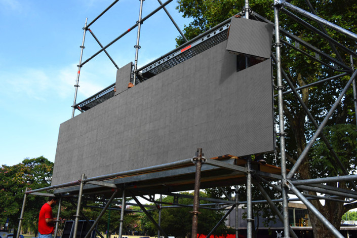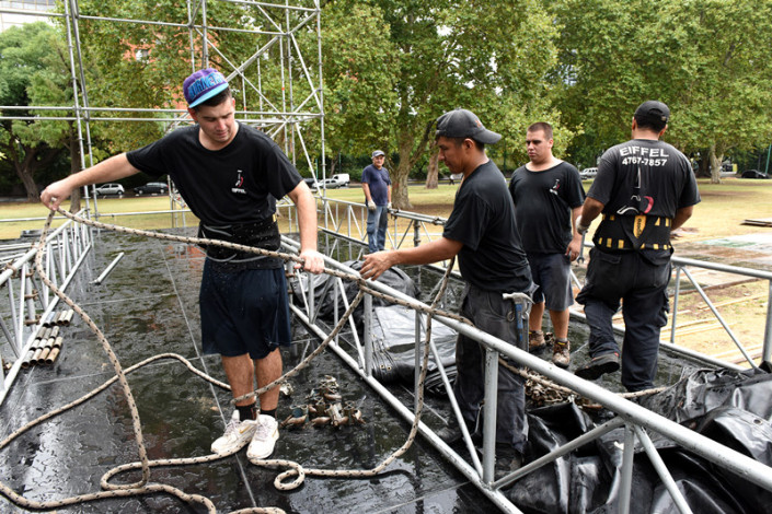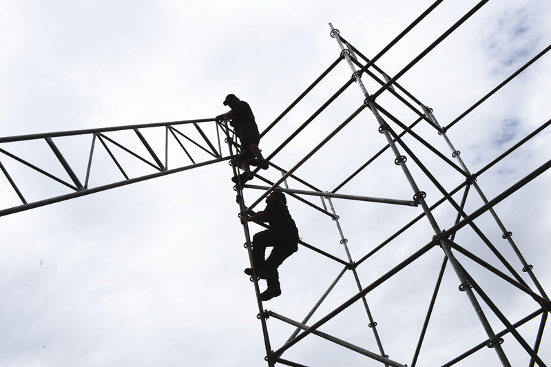 舞台搭建是非常重要的一环,安装工人在公司经理的带领下,雨中仍然继续工作。他们清晨6点钟,就在单位搬运设备,8点钟就进入了工作场地。舞台建好后才能够进行其他设备的安装,所以,他们抢前抓早正在进行紧张进行施工。