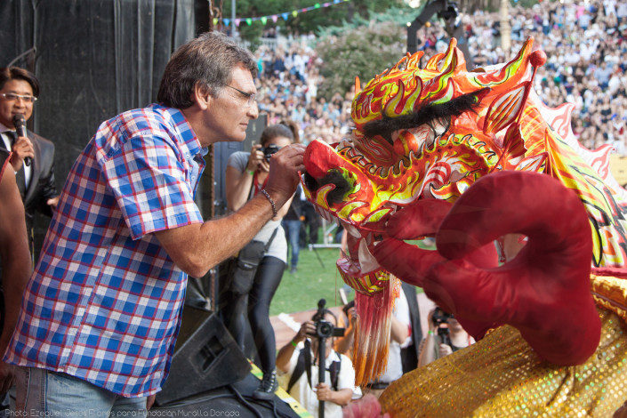 当天傍晚六点,布宜诺斯艾利斯市区“中国城”前的巴兰卡斯公园内万头攒动,近三万的旅阿华人华侨和阿根廷当地居民欢声笑语等待着2015年阿根廷华人“欢乐春节”庙会的开幕。随着中国驻阿根廷大使馆临时代办、政务参赞朱京阳用朱砂为两条装饰华丽的彩龙点睛,为期两天的庙会活动正式开幕。