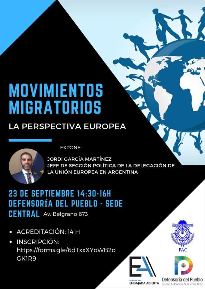Organizado por la Defensoría del Pueblo y la Fundación Embajada Abierta, se llevó a cabo la jornada “Movimientos Migratorios”. Alejandro Amor, Defensor del Pueblo de la Ciudad de Buenos Aires, Jorge Argüello, presidente de la Fundación Embajada Abierta y Jordi García Martínez, representante de la Unión Europea en Argentina, tuvieron a cargo los discursos que dieron lugar al debate y las consultas por parte de los asistentes.
